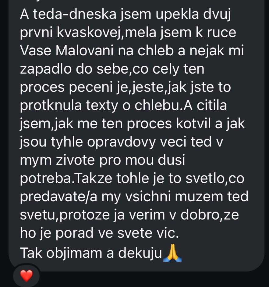 Bez něj by nám doma něco chybělo. Když je chléb na stole, znamená to, že nebudeme mít hlad, ale taky je to tichá, opakující se kulisa něčeho důvěrně znamého – chvil, kdy je doma láskyplně, dobře a útulně. Věřím, že vůně a chuť chleba se společně s vůní čerstvě namleté kávy otisknou ve vzpomínkách našich dětí jako ony slavné Proustovy madlenky…